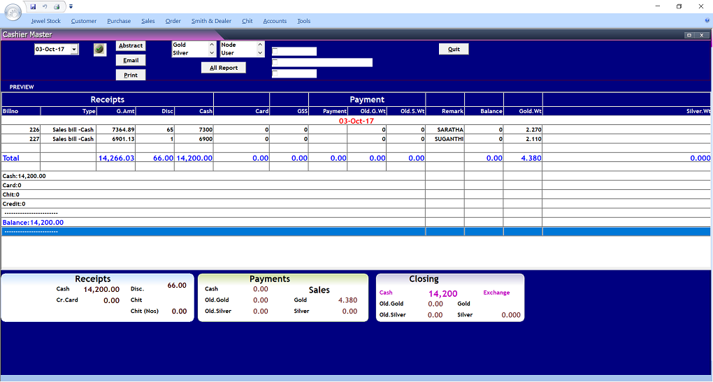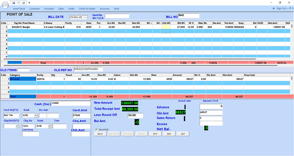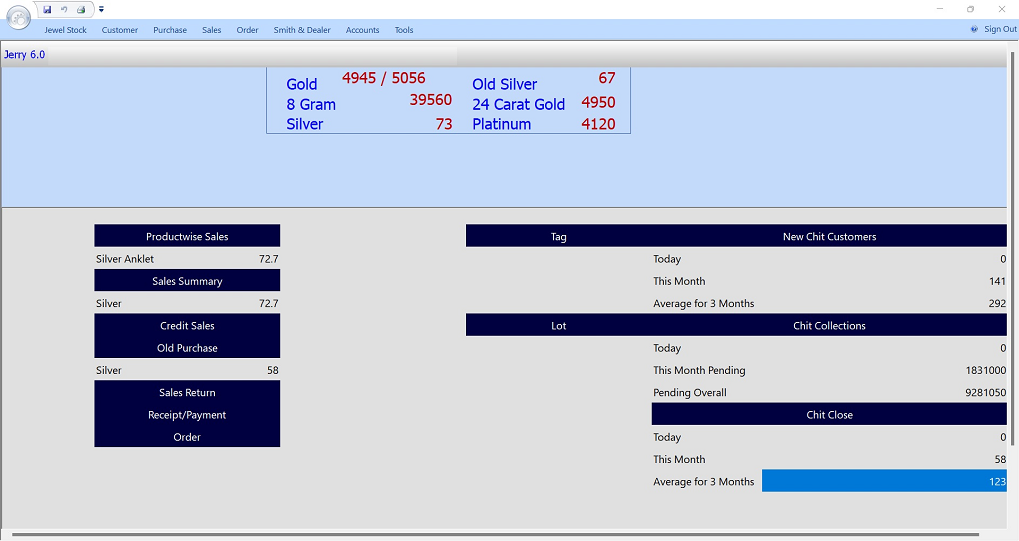 | Reports | Sales Report,Old Purchase Report,New Purchase Report,Stock Report,MIS Report,Cashier Report,GST Report,Chit Report |