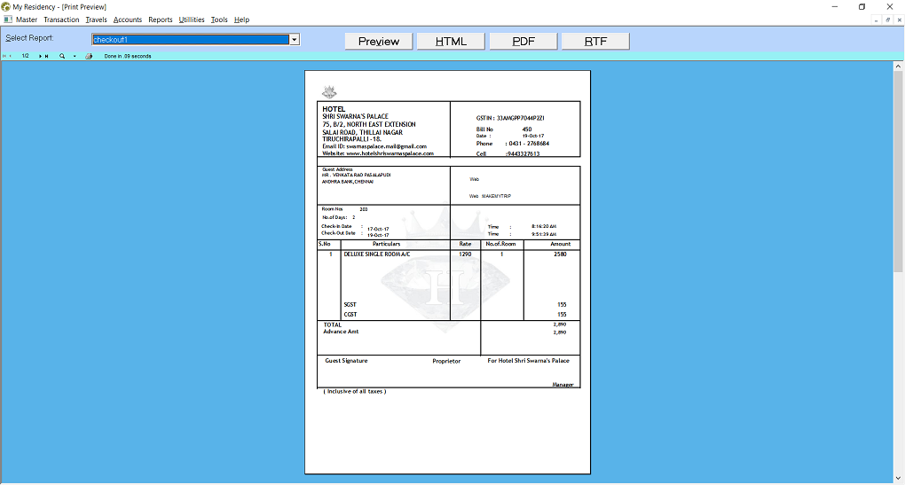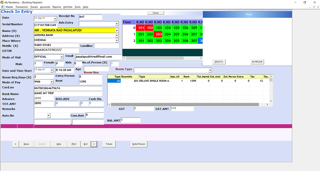 | Reports | Check In Report,Check Out Report Advance Reminder GST Report Daily Report Daybook,Cashbook |