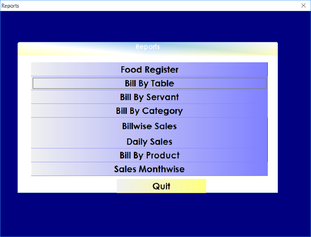 | Reports | Daily collection Report,hall wise report,table and servant wise reports,daily bill abstract and SMS |