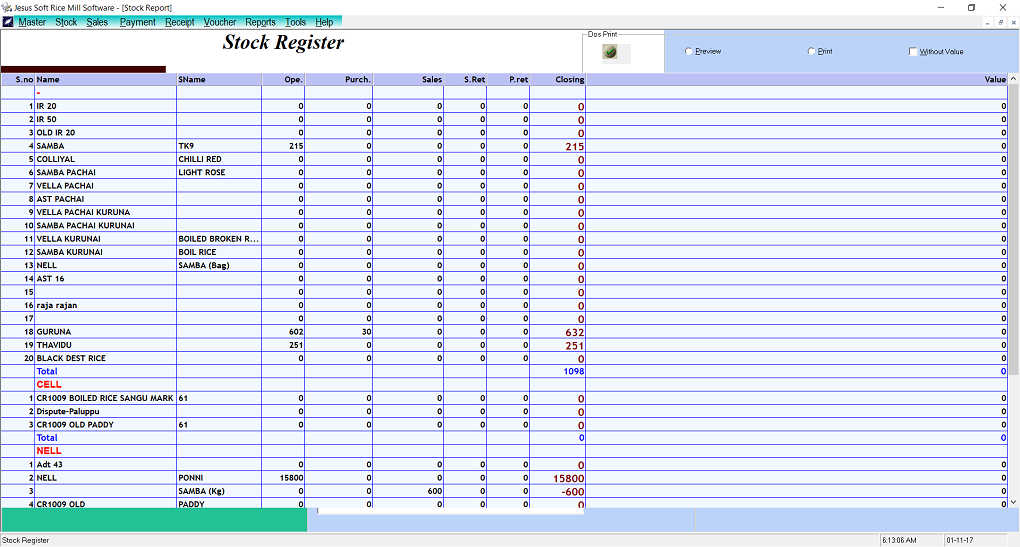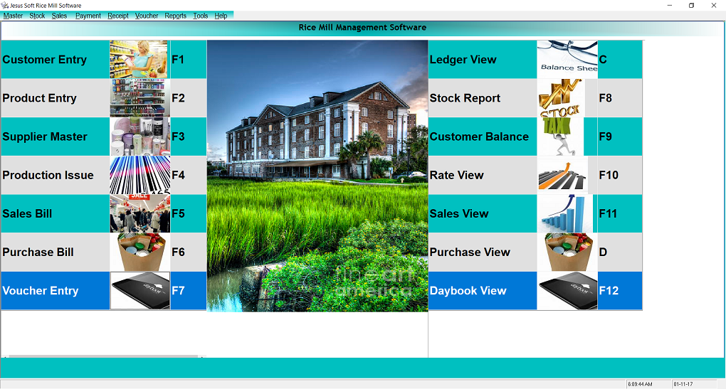| Masters | Rice Master,Paddy Master,Farmer Master,Supplier Master Customer Master,Machinery |