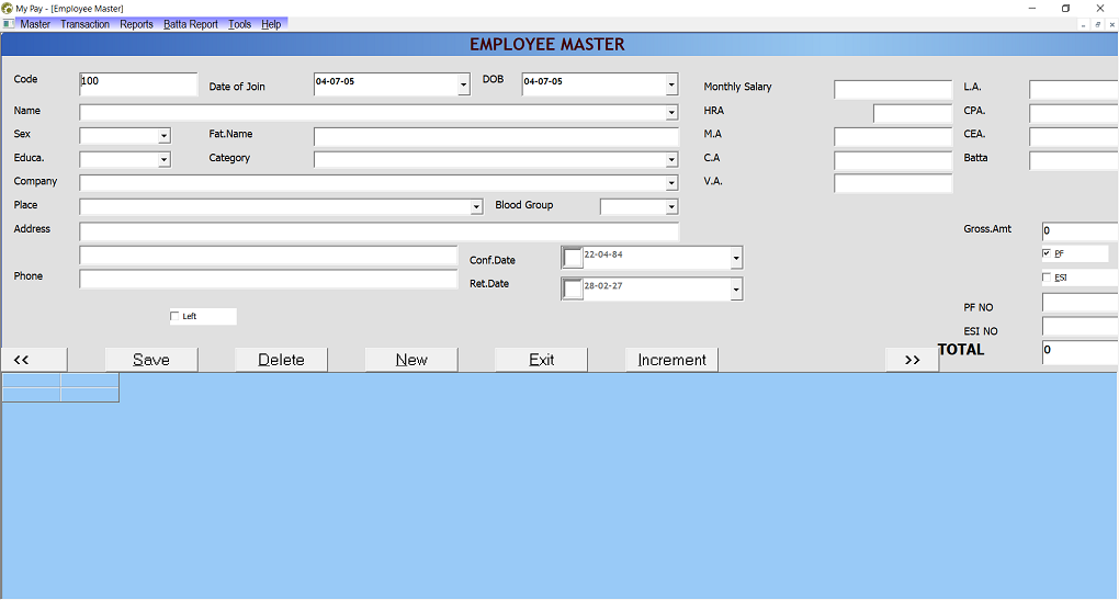 | Masters | Employee Master,Section Master,Pf Esi Master Piece Rate Master Bonus Slab Master |
