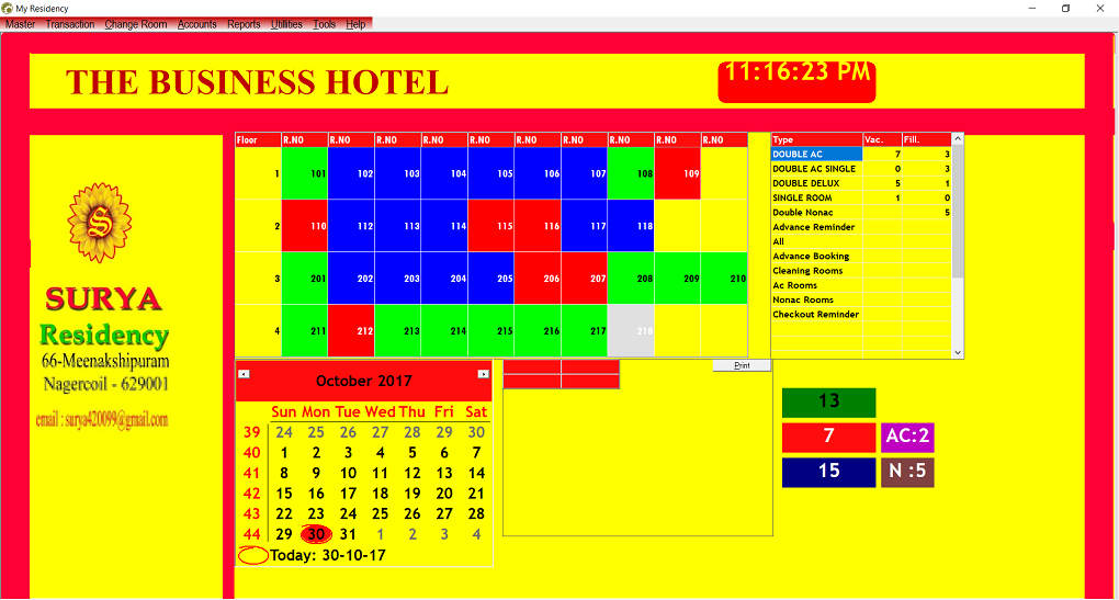 | Masters | Room Type Master,Room Master,Tax Master,Customer Master Staff Master Laundry Master Stock Master |