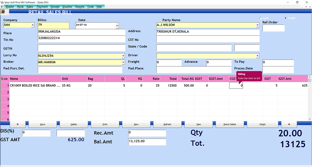 | Reports | Stock Report,Sales Report,Sales Brokerwise Purchase Report,GST Report Payable,Receivable Ledgers Daybook,Cashbook,Trial Balance Balance Sheet and Profit and Loss |